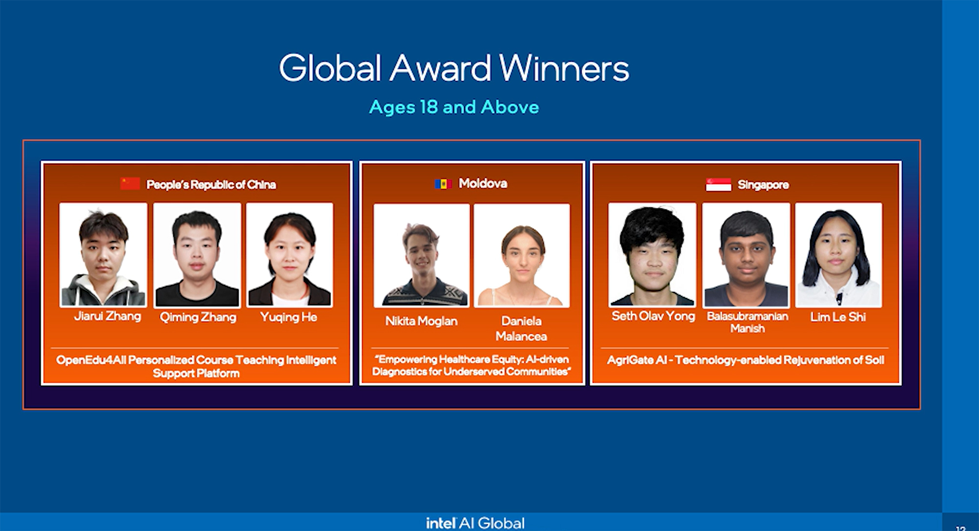 華東師大OpenEdu4All團隊(左一)斬獲2024年英特爾人工智能全球影響力嘉年華18歲以上年齡組全球大獎