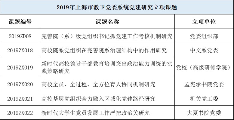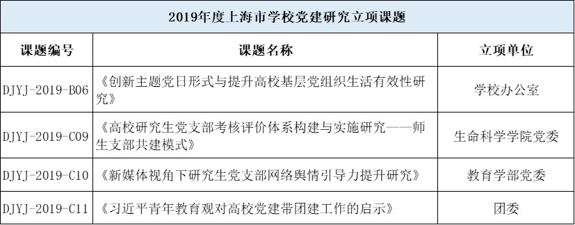 我校共有4項黨建研究課題獲得2019年上海市學校黨建研究課題立項,學校辦公室課題組《創新主題黨日形式與提升高校基層黨組織生活有效性研究》獲得重點課題立項;另有6項黨建研究課題獲得2019年市教衛黨委系統黨建研究會立項,黨委組織部主持的《完善院(系)黨組織書記抓黨建工作考核機制研究》獲得重點課題立項。