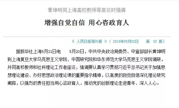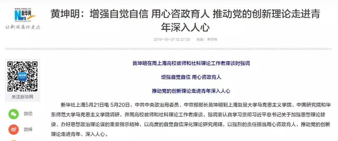 2019年5月21日,CCTV-1晚間新聞:中宣部部長黃坤明到華東師大馬克思主義學院調研