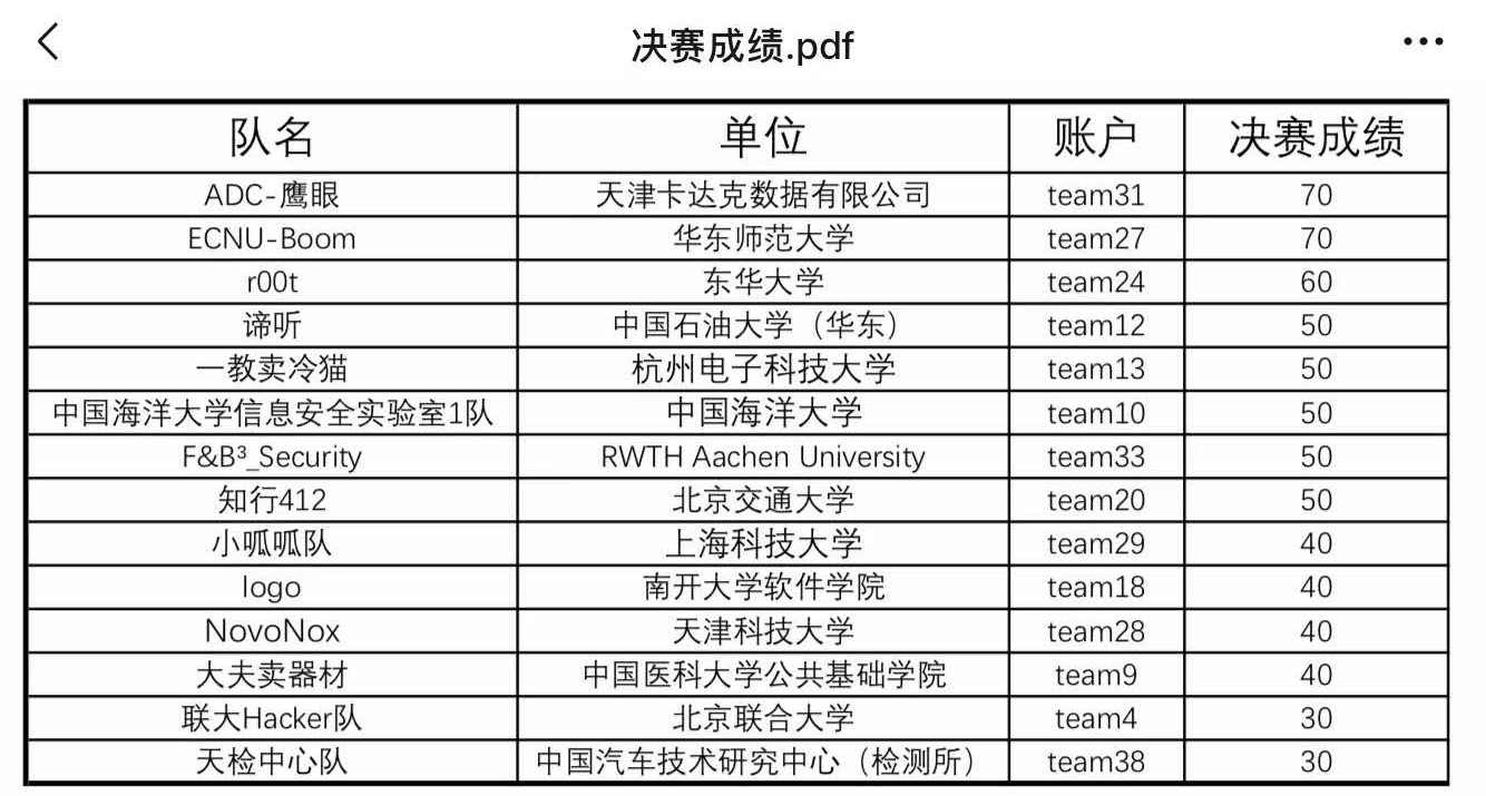 決賽的競賽內容與初賽略有不同,但需要依次破解三輛車,以固定時間破解車輛協議數量更多者為勝,這不僅十分考驗選手們對于不同車型、不同環境下的技術應用能力,更加考驗選手們在遇到破解困境時的臨場應變能力與抗壓能力。經過激烈的決賽角逐,我校團隊和另一支企業級隊伍最終并列第一。