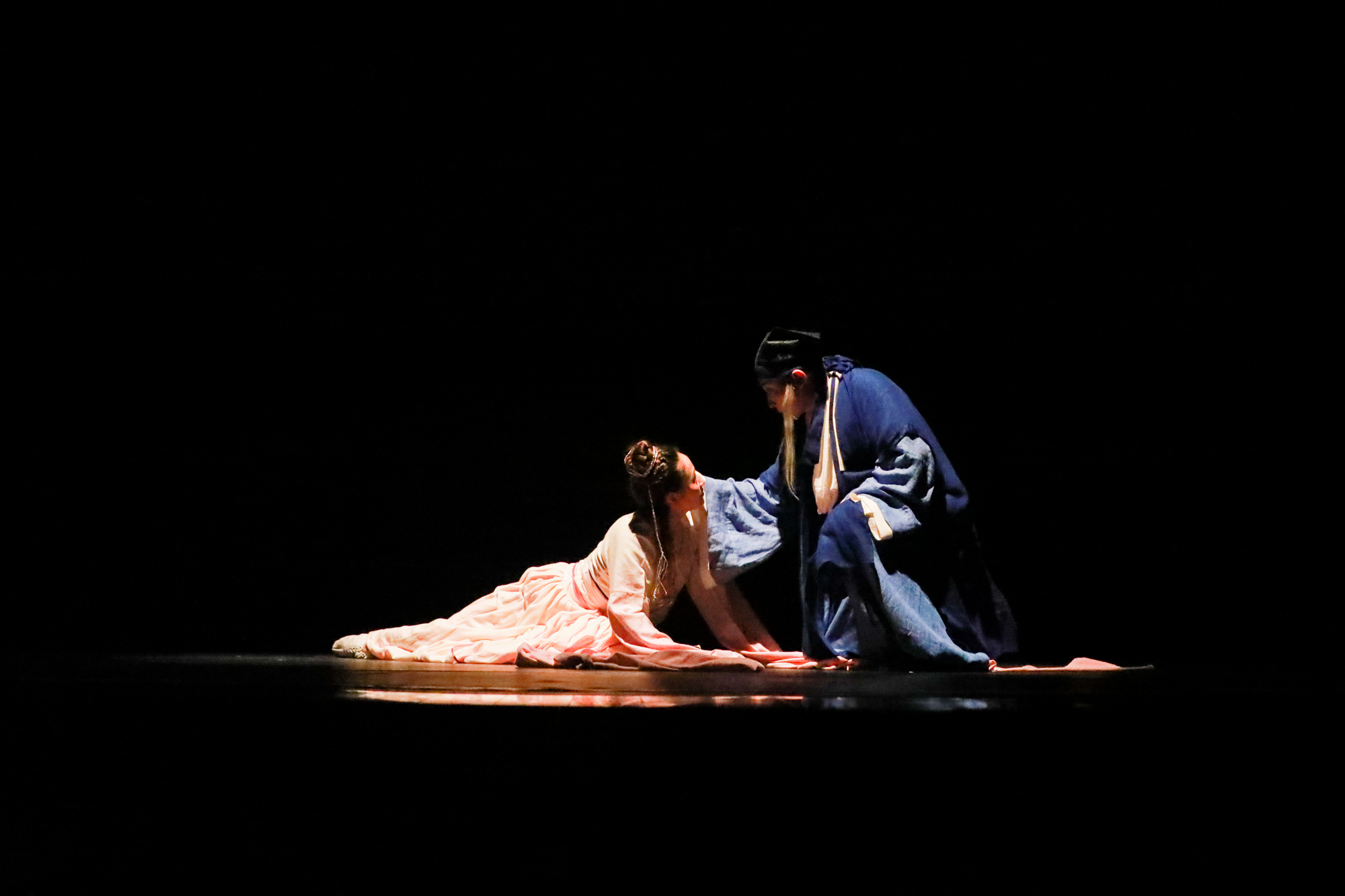 這部舞臺劇以流傳千年的中國傳統愛情故事為藍本,通過新穎的西方視角演繹了一出別開生面的“白娘子傳奇”。演員們有著傳統戲曲扮相,又在表演中融入了大量動感的現代化的肢體語言,一個動作、一個眼神都有著極強的感染力,熱烈與內斂碰撞,現代與古典交融,現場觀眾或喜或悲、深深沉浸在這場視覺和聽覺的美妙之旅中。該劇的舞臺布置與造景同樣出彩,舍棄了一般舞臺劇使用的假山假石、屏風等笨重瑣碎的道具,舞臺上僅留幾扇白幕,在這宛若國畫畫紙的投影白幕上,山水、游船、端午龍舟、雷峰塔等景象逐一顯現,在方寸舞臺之上展示了壯闊的古寺與湖山。遍布舞臺的濃墨重彩勾勒出一幅幅動人的水墨畫,為演員的表演提供了一個大氣而絢麗的場景。