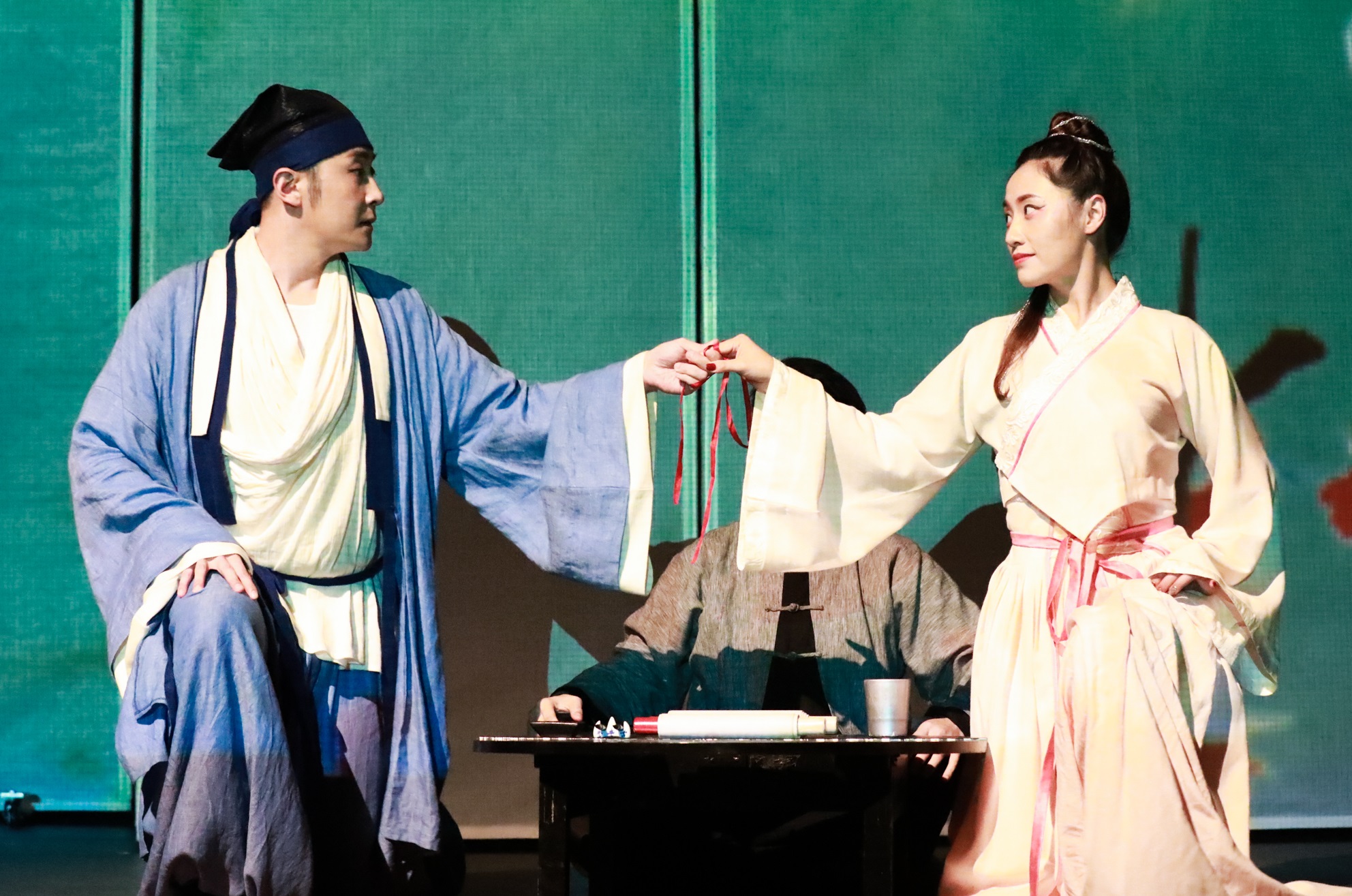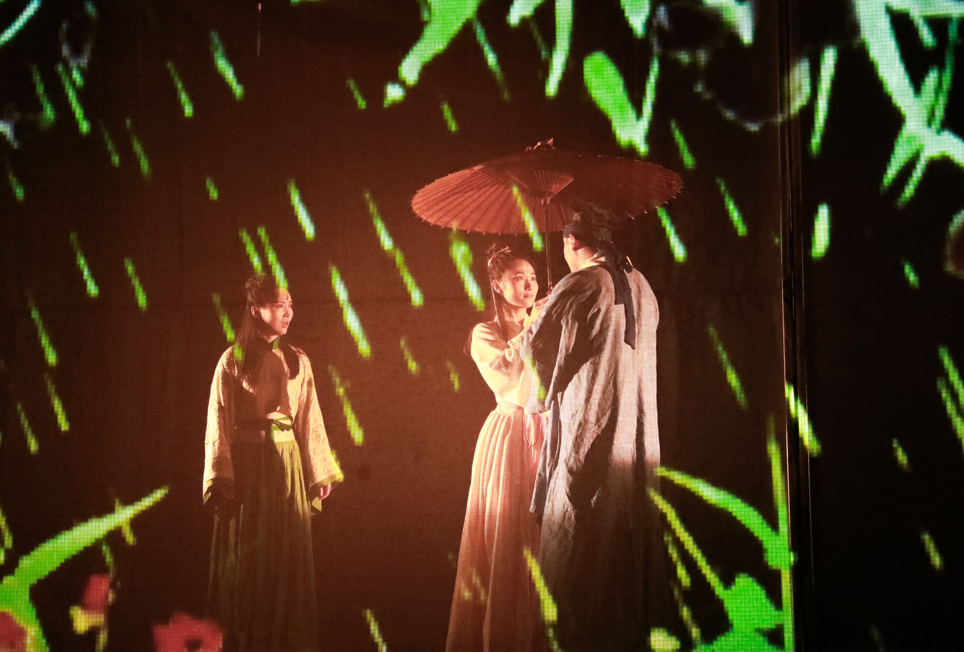 黑暗中,一束絢麗的光芒橫貫演出廳上方,白色的幕布上映照出一幅幅水墨圖景,舞臺一側,一個布衣男子正緩緩講述一個流傳許久的故事。這正是4月25日晚于我校大夏舞臺上演的、由上海話劇藝術中心出品的多媒體舞臺劇《白蛇傳》。