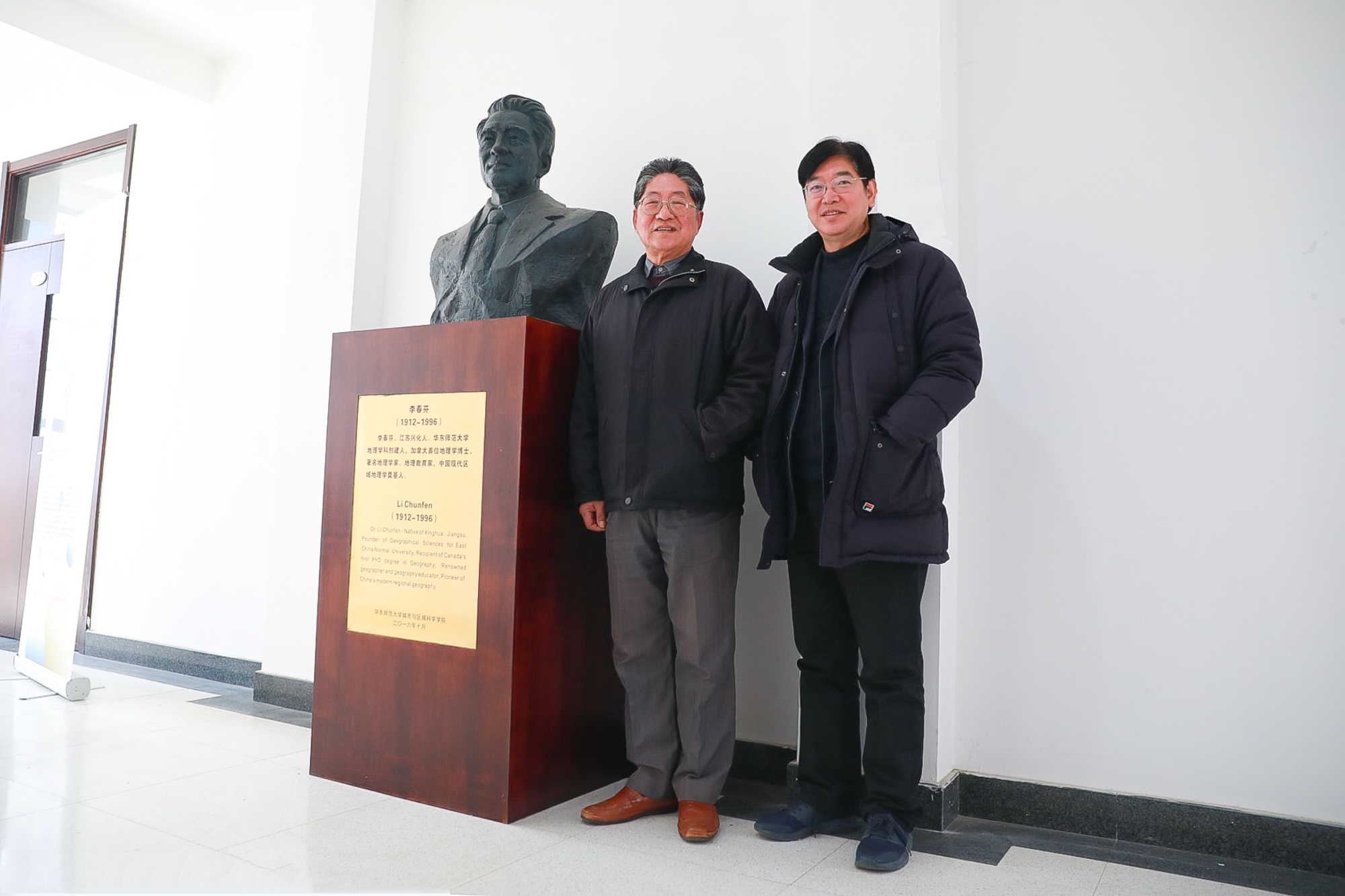 杜德斌(右)、蔣長瑜與李春芬銅像合影