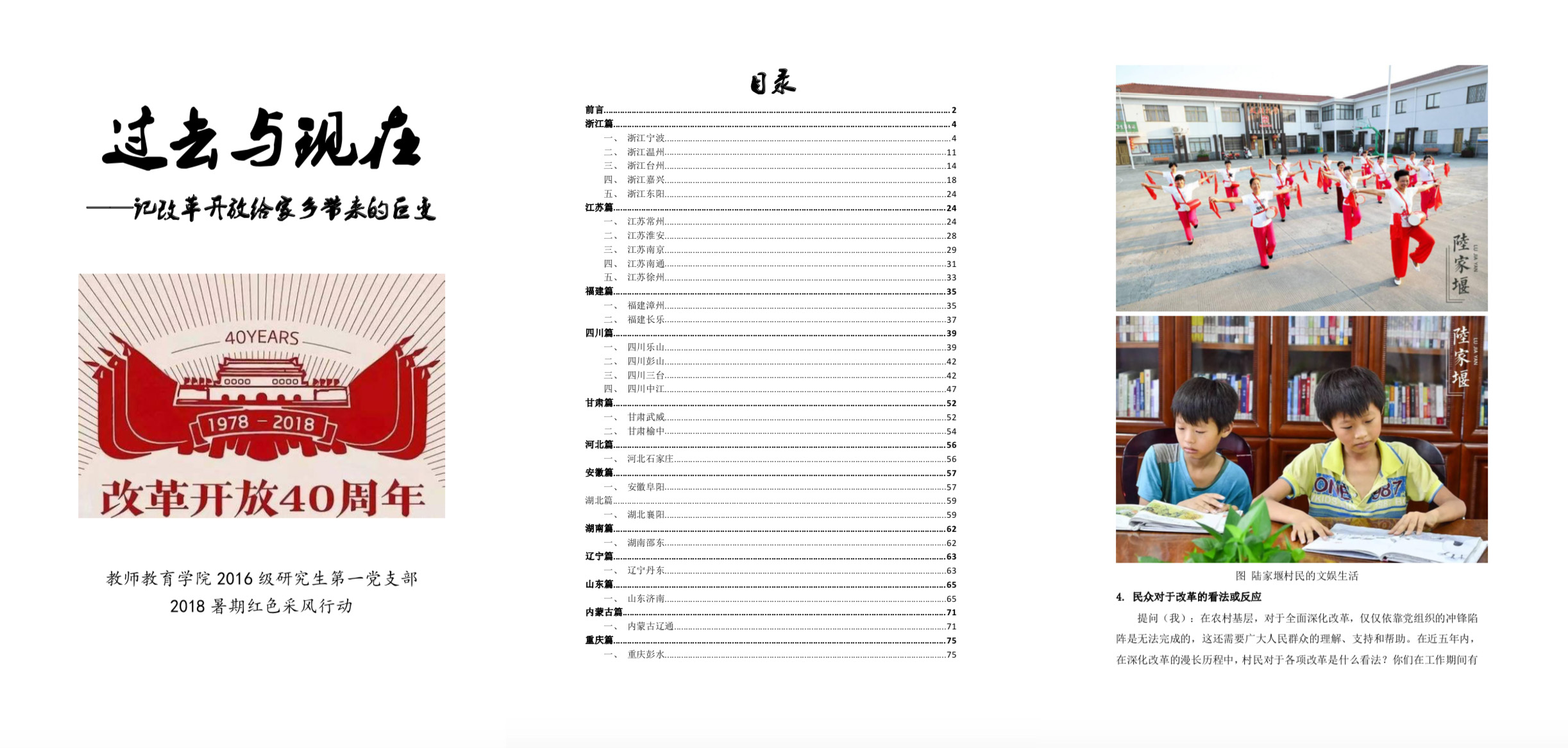 支部致力于引導黨員關注國家和社會的發展,積極組織黨員投身社會實踐,參與教育改革。2017年,支部開展了“尋訪歷史,繼往開來——教師教育學院各學科教育專業發展史追本溯源”暑期社會實踐活動。黨員們訪談了學科教育專業的老教授7人,認真梳理華東師范大學各學科教育的發展歷史,形成了語文、數學、地理、歷史等學科的6篇調查報告。2018年,為紀念改革開放40周年,支部開展“過去與現在——記改革開放給家鄉帶來的巨變”社會實踐,形成了76頁涵蓋全國二十多個地區的調查報告。