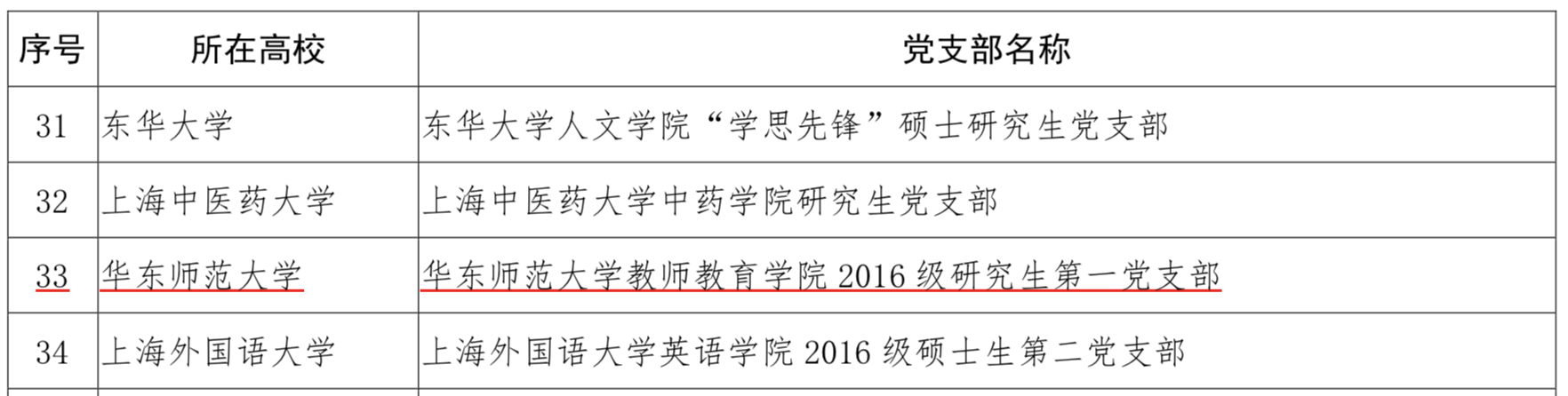 2018年12月,根據《教育部辦公廳關于開展高校“百個研究生樣板黨支部”和“百名研究生黨員標兵”創建工作的通知》安排和評審工作方案,經組織推薦、專家通訊評審、教育部黨建工作領導小組成員單位集中審議,遴選產生了100個研究生樣板黨支部、100名研究生黨員標兵。其中,上海高校共有11個黨支部、7名研究生入選。教師教育學院2016級研究生第一黨支部代表我校參評并成功入選“百個研究生樣板黨支部”。