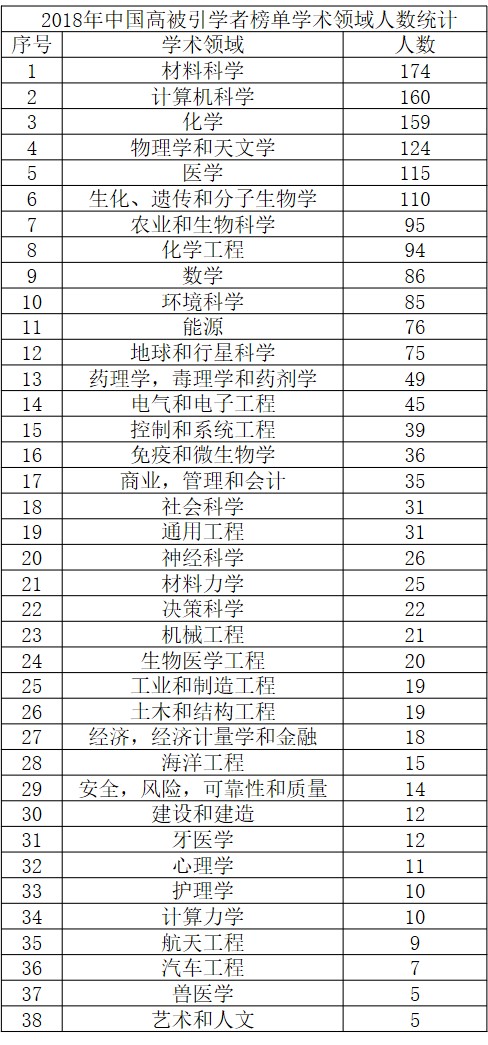 與去年的榜單對比,在2018中國高被引學(xué)者榜單中,有137人為今年新增的高被引學(xué)者,其中高校新增117人。縱觀高校完整榜單,入選的學(xué)者共分布在38個(gè)不同的學(xué)術(shù)領(lǐng)域內(nèi),其中材料科學(xué)共174位、計(jì)算機(jī)科學(xué)160位、化學(xué)159位,物理學(xué)和天文學(xué)、醫(yī)學(xué)、生化,遺傳和分子生物學(xué)均有超過100位學(xué)者入選。