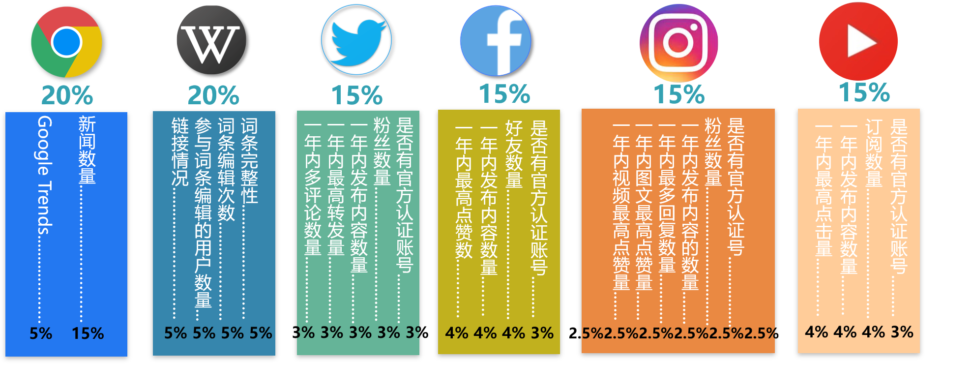 中國大學海外網絡傳播力報告由北京師范大學新媒體傳播研究中心、北京師范大學教育新聞與傳媒研究中心、光明日報智庫研究與發布中心以及中國日報網聯合發布。研究團隊選取我國184所高校進行考察,其中我國內地高校141所(涵蓋所有“雙一流”大學和原211大學)以及港澳臺地區高校43所,同時選擇了4所日韓大學、4所美國大學作為參照。通過挖掘Google、維基百科、Facebook、Twitter、Instagram、YouTube六個平臺數據,對中國高校的海外網絡傳播力做全景分析,其中YouTube平臺為2018年新增考核數據。具體考量范疇及比重分別是: