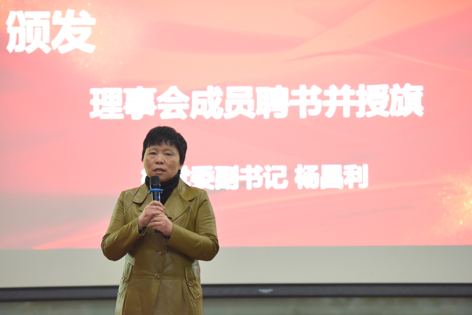 校黨委副書記楊昌利向輔導員協會第一屆理事會成員頒發聘書并授旗