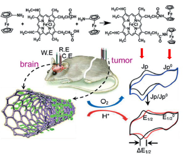 最近,他們將這一分析策略進一步提升,設計并合成了雙響應比率型單分子探針Hemin-Fc。該分子中的Hemin基團可實現對O2和pH的雙響應,而Fc基團可作為內參比,提升測定準確性。最終,通過將Hemin-Fc修飾于碳納米管微電極上,構建了O2和pH同時分析的電化學傳感。田陽教授團隊首次采用二條插值法,報道了缺血時不同腦區以及腫瘤饑餓治療期間O2和pH的改變(Angew. Chem. Int. Ed., 2017, 56, 10471-10475)。由于方法的創新性及可靠性,上海交通大學附屬醫學院神經生物學家徐天樂團隊、復旦大學附屬中山醫院丁小強團隊正應用田陽教授團隊所發展的探針,研究腦神經的生理病理過程。