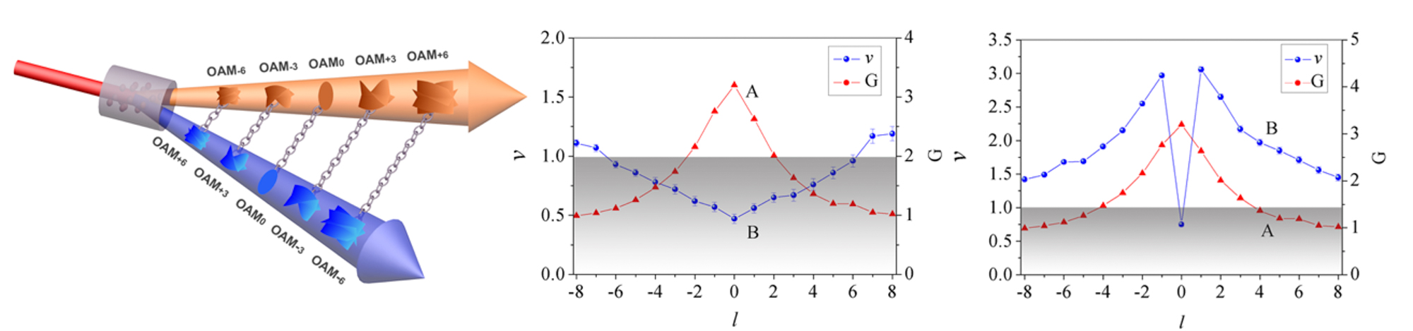 為LG模式對應的光學軌道角動量拓撲荷數,Pr和Conj代表兩個孿生光束通道。該團隊發(fā)展了基于LG模式的量子糾纏探測方案,并利用這一探測方案成功在實驗上驗證了這些對應模式之間的量子糾纏特性。同時該工作還驗證了系統(tǒng)中