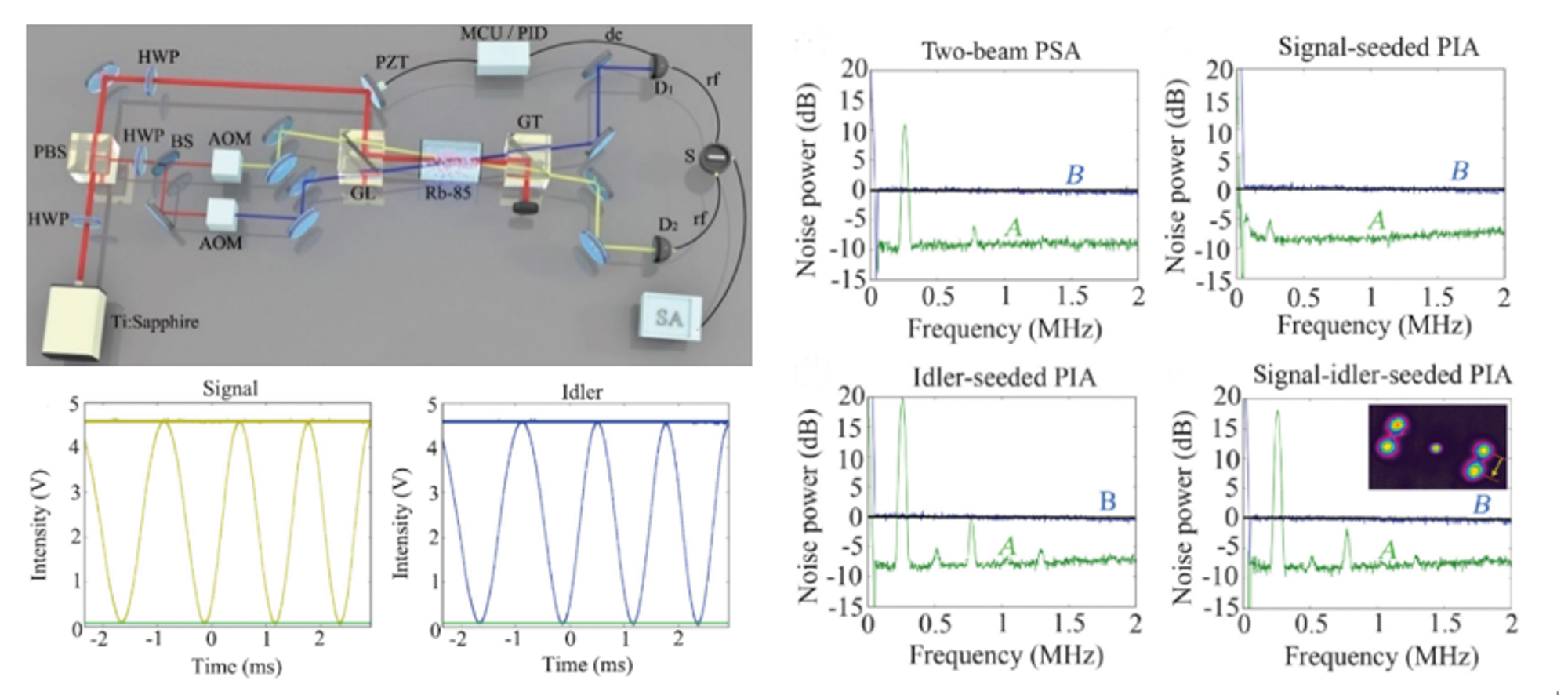 近幾年,基于原子系綜四波混頻過程的非相敏放大器被證明是產生量子壓縮的一種非常有效的方法。由該系統(tǒng)產生的量子壓縮光束在量子成像、量子糾纏延遲以及非線性干涉儀等領域得到了重要的應用。與此不同,該團隊另辟蹊徑,在實驗上實現了利用相敏放大器中的干涉效應來增強量子壓縮的方案。