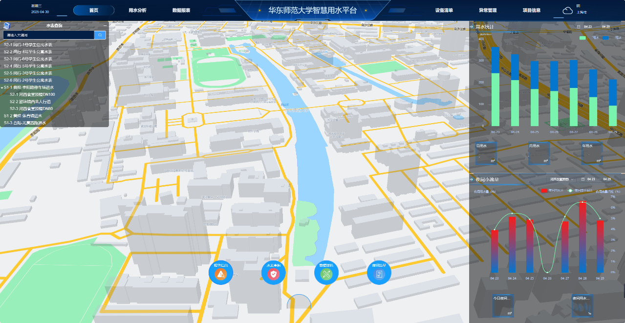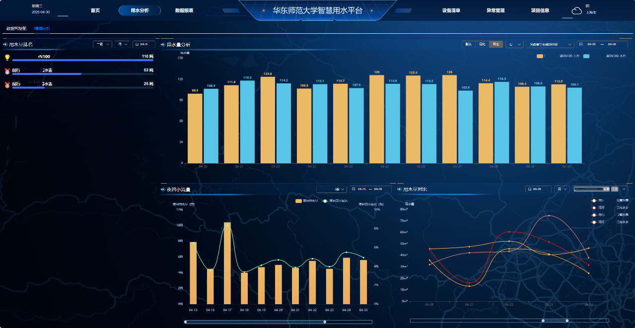 智慧用水管理平臺系統(tǒng)部署智能水表及傳感器,300+個水計量點位,實時監(jiān)測各樓宇用水數據,結合夜間最小流量分析模塊,精準識別管網滲漏,并通過用水異常預警功能及時定位異常消耗,實現(xiàn)漏損控制智化。2025年一季度閔行校區(qū)用水量同比下降9%,生動詮釋了科技賦能資源集約化的雙重價值。