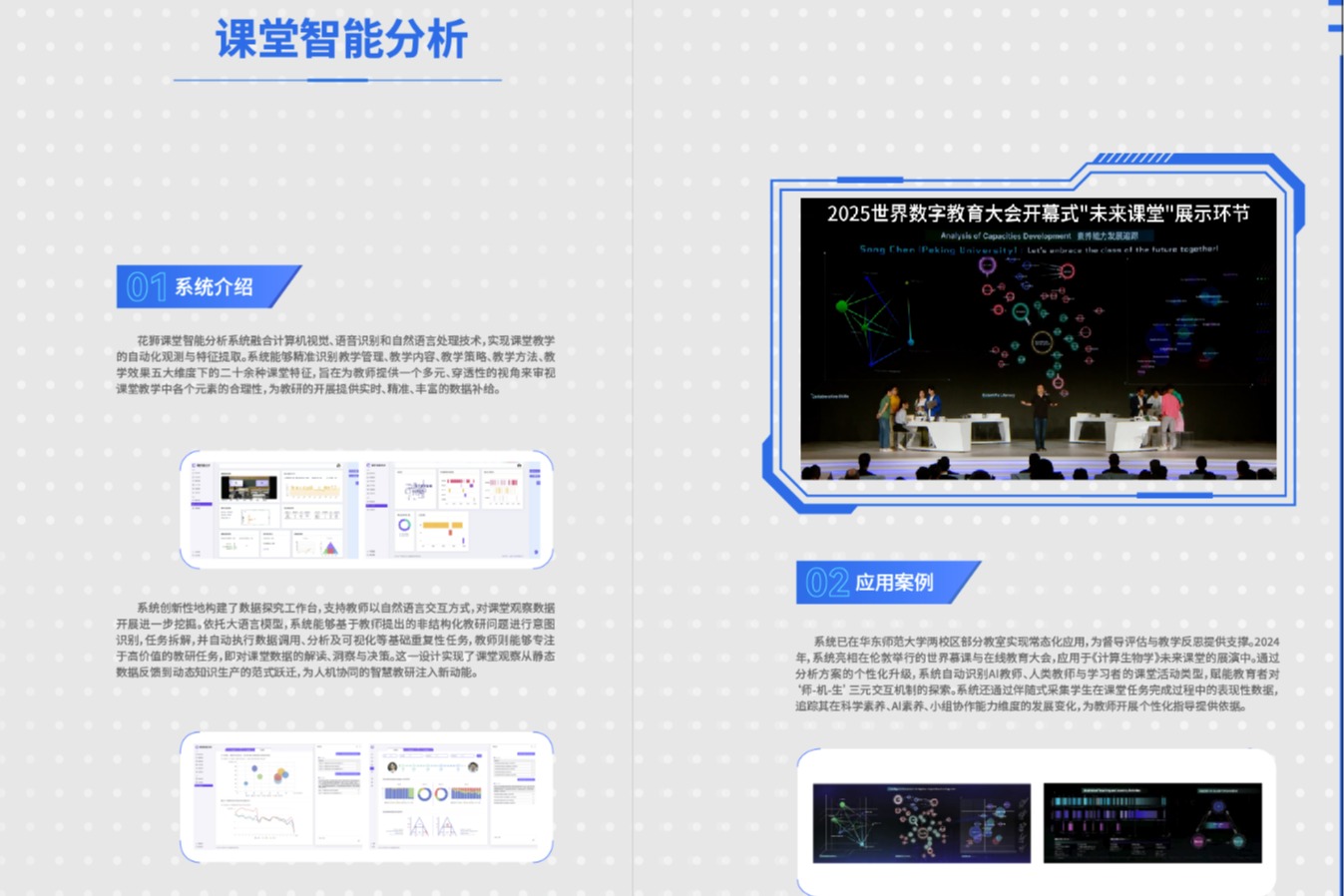 “課堂智能分析系統”采用多模態智能分析技術,自動識別課堂教學的多維特征,創新性地構建了數據探究工作臺,支持教師以自然語言交互方式,對課堂觀察數據開展進一步挖掘,實現了課堂觀察從靜態數據反饋到動態知識生產的范式躍遷。該系統已在華東師大兩校區開展部署,并于日前亮相2025世界數字教育大會開幕式“未來課堂”演示環節,為數據驅動的教學創新提供了實踐范例。