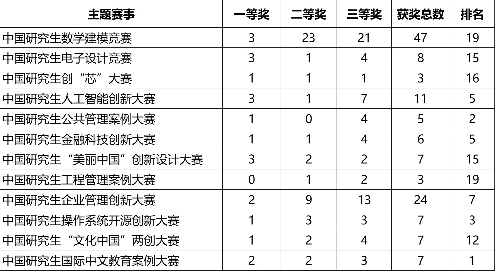 其中,第十九屆中國研究生電子設計競賽全國一等獎3項(2項進入全國TOP10),第七屆中國研究生創“芯”大賽全國一等獎1項,第六屆中國研究生人工智能創新大賽全國一等獎3項(1項進入全國TOP18冠軍爭奪賽),第一屆中國研究生操作系統開源創新大賽全國一等獎1項(全國共8項),第八屆中國研究生公共管理案例大賽全國特等獎(第一名)1項,第三屆中國研究生金融科技創新大賽全國一等獎1項(銅獎,全國第四),第二屆中國研究生企業管理創新大賽全國一等獎2項,第三屆中國研究生“美麗中國”創新大賽全國一等獎3項,第一屆中國研究生“文化中國”兩創大賽全國一等獎1項(進入全國TOP11冠軍爭奪賽),第一屆中國研究生國際中文教育案例大賽全國一等獎2項(包攬冠亞軍),第二十一屆中國研究生數學建模競賽全國一等獎3項。