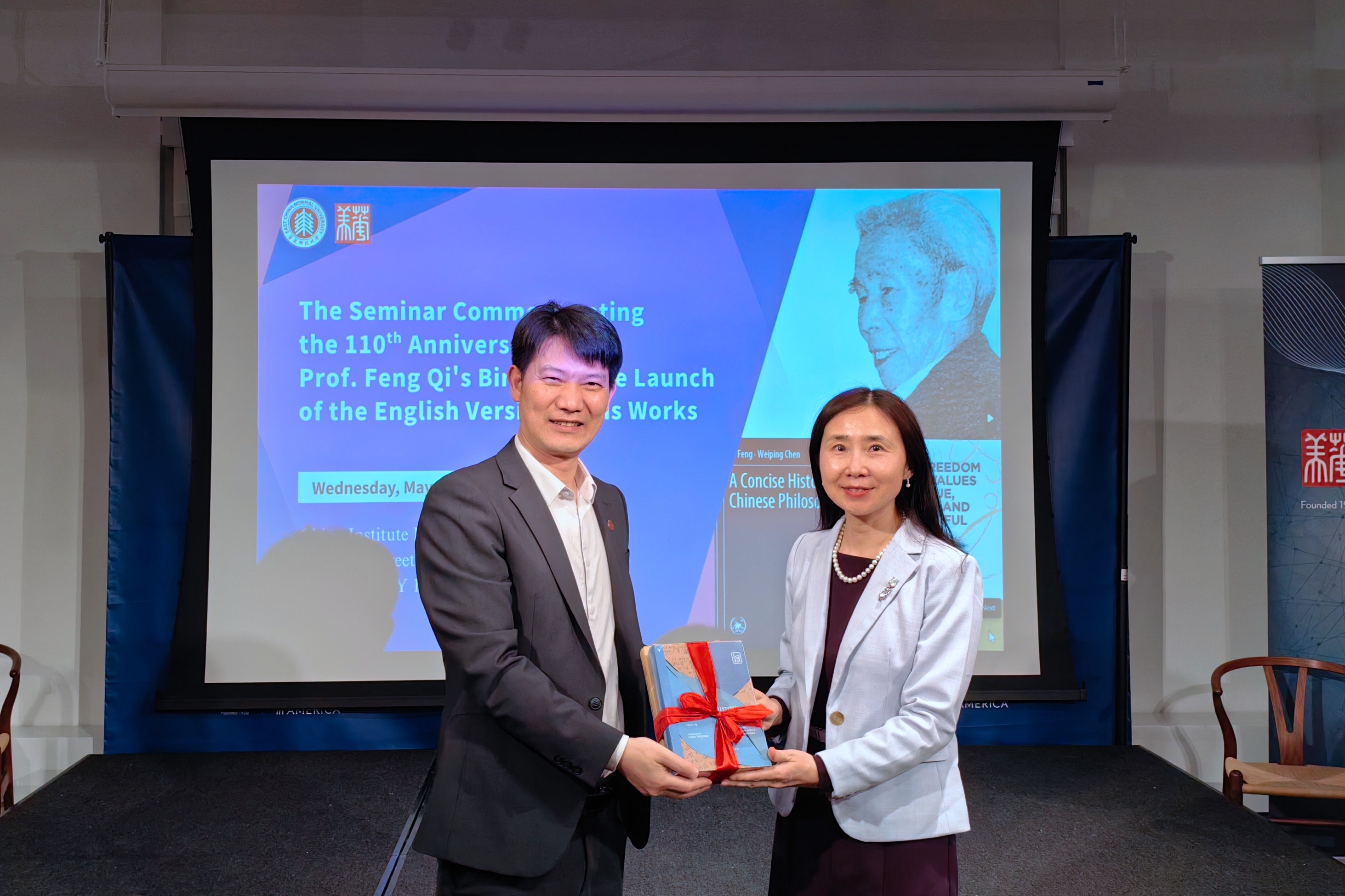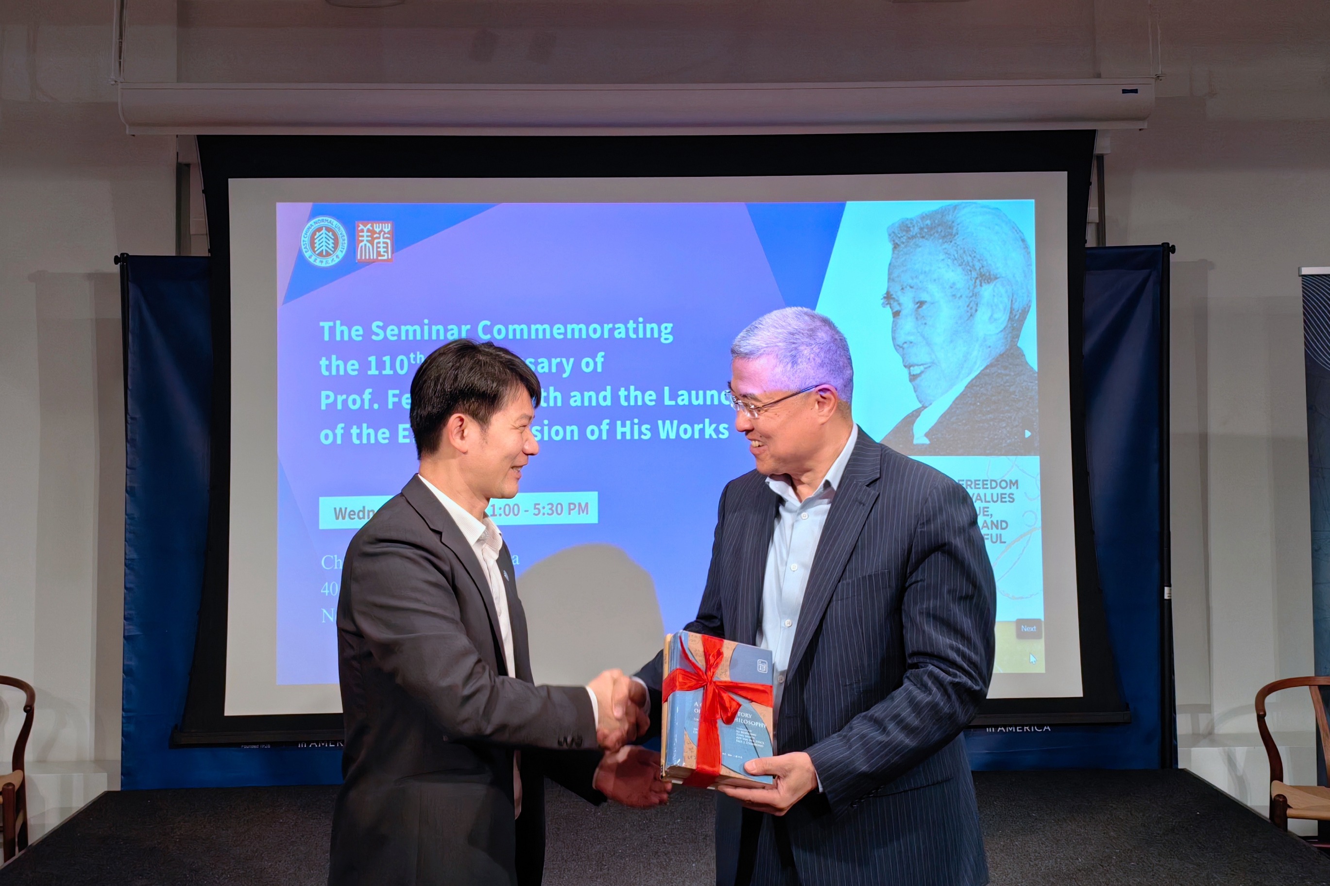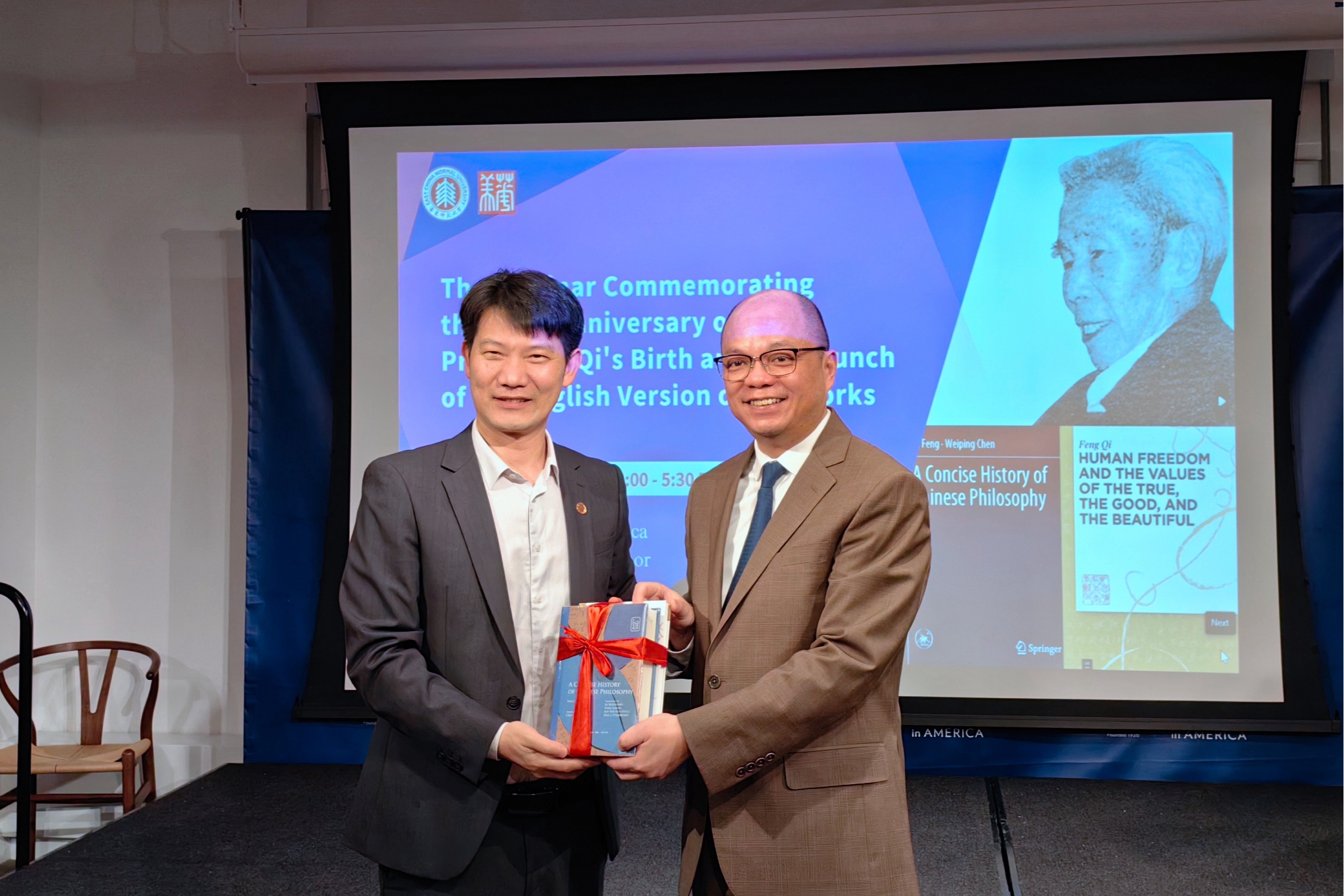 在華美協(xié)進(jìn)社,代表團(tuán)出席紀(jì)念中國(guó)哲學(xué)家馮契先生(1915-1995)誕辰110周年暨馮契著作《人的自由和真善美》《中國(guó)哲學(xué)通史簡(jiǎn)編》英譯本發(fā)布會(huì)及研討會(huì)活動(dòng)。中國(guó)駐紐約總領(lǐng)事館教育參贊余有根、華美協(xié)進(jìn)社社長(zhǎng)葛曉初、上海紐約大學(xué)校長(zhǎng)童世駿等嘉賓出席活動(dòng)并致辭,美國(guó)哥倫比亞大學(xué)教育學(xué)院、加州大學(xué)河濱分校、肯庸學(xué)院及洛約拉瑪麗蒙特大學(xué)的多位學(xué)者參與活動(dòng)。吳健在致辭中回顧馮契先生作為華東師大哲學(xué)系創(chuàng)始人在中國(guó)現(xiàn)代哲學(xué)體系建設(shè)中的卓越貢獻(xiàn),并分享學(xué)校近年來(lái)在全球?qū)W術(shù)舞臺(tái)展現(xiàn)的卓越影響力。他表示,華東師大將積極在更多領(lǐng)域助推中美文化和學(xué)術(shù)深層次對(duì)話。在贈(zèng)書儀式環(huán)節(jié),吳健代表華東師大分別向中國(guó)駐紐約總領(lǐng)事館、華美協(xié)進(jìn)社和哥倫比亞大學(xué)教育學(xué)院贈(zèng)送《馮契文集》及兩部英譯著作。