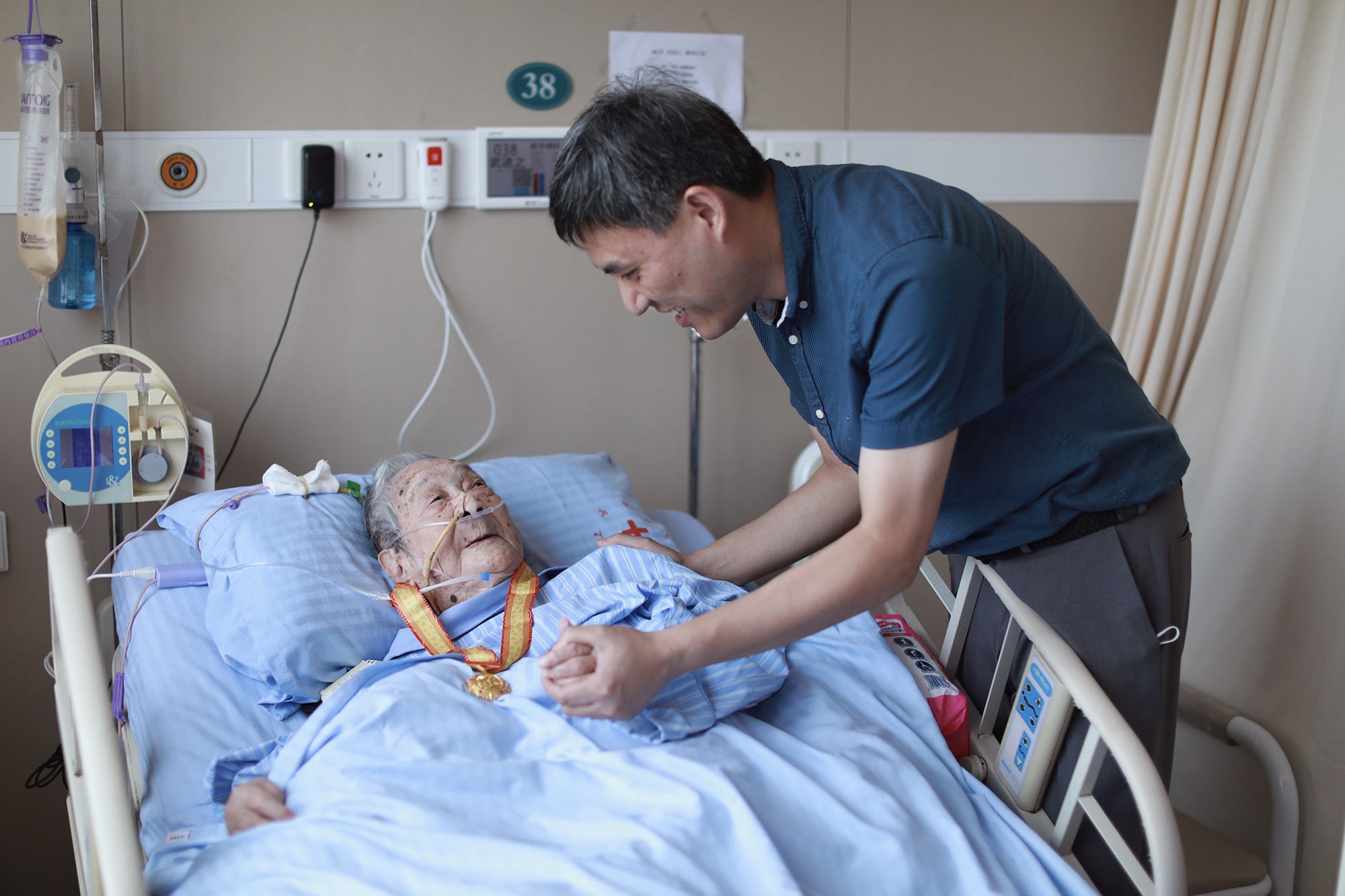 98歲高齡的蔣其義老師在接受紀念章后,鄭重地提出要在所有在場人員的見證下宣誓。他挺直身軀,舉起右手,以鏗鏘之聲說道:“我宣誓,只要我活在這個地球上,一天也好,一年也好,十年也好,我一定為共產主義事業奮斗到底,奮斗終身!”這一刻,房間內肅穆而莊重,老人眼中閃爍的光芒,跨越時空連接著烽火歲月與和平年代,令在場每一個人無不動容。