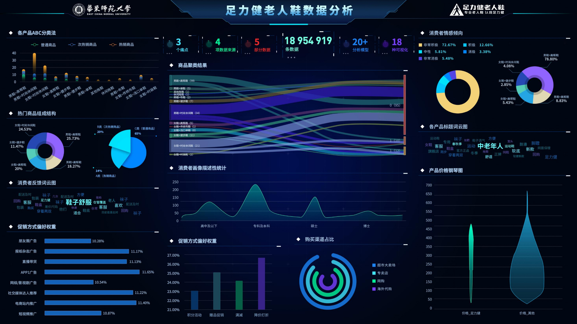 例如,在大賽中獲得全國特等獎的項目:“兩步并行:銀發基本盤X年輕新增量——足力健商務大數據分析”聚焦于“銀發經濟”背景下老年鞋市場的機遇與挑戰,以電商領域的經典模型“人貨場理論”為分析框架,運用十五種數據分析方法,從宏觀到微觀、從描述性分析到預測性分析,全面剖析了足力健品牌在用戶、貨品、場域三個維度的經營現狀及發展瓶頸。