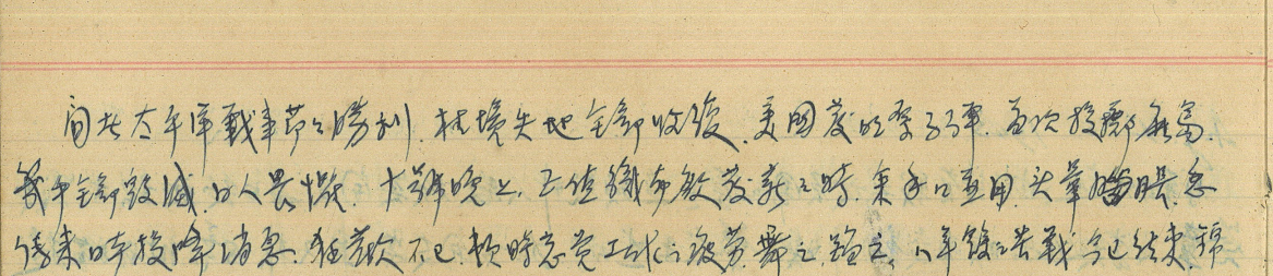 間者太平洋戰事節節勝利,桂境失地全部收復。美國發明原子彈,首次投擲廣島,幾乎全部毀滅,日人畏懼。十號晚上,正值織布廠發薪之時,余手口并用,頭暈腦脹。忽傳來日本投降消息,狂歡不已,頓時忘覺工作之疲勞,舞之蹈之……