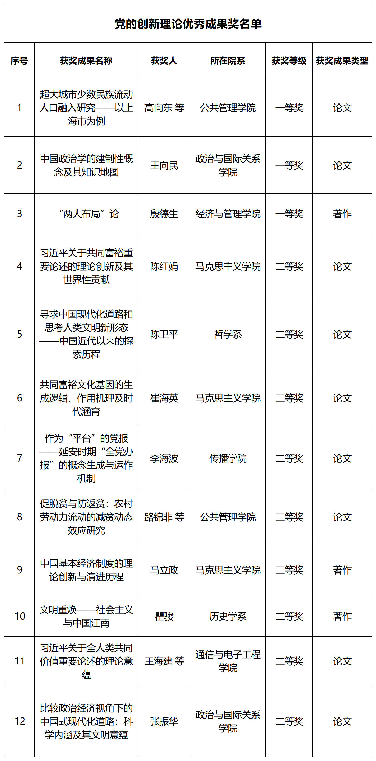 馬克思主義理論學科獲獎成果,聚焦“黨的創新理論闡釋與傳播”,進一步回應“馬克思主義如何中國化”的核心問題,為黨的創新理論“飛入尋常百姓家”提供學術支撐,直接服務上海“黨的創新理論研究高地”建設。