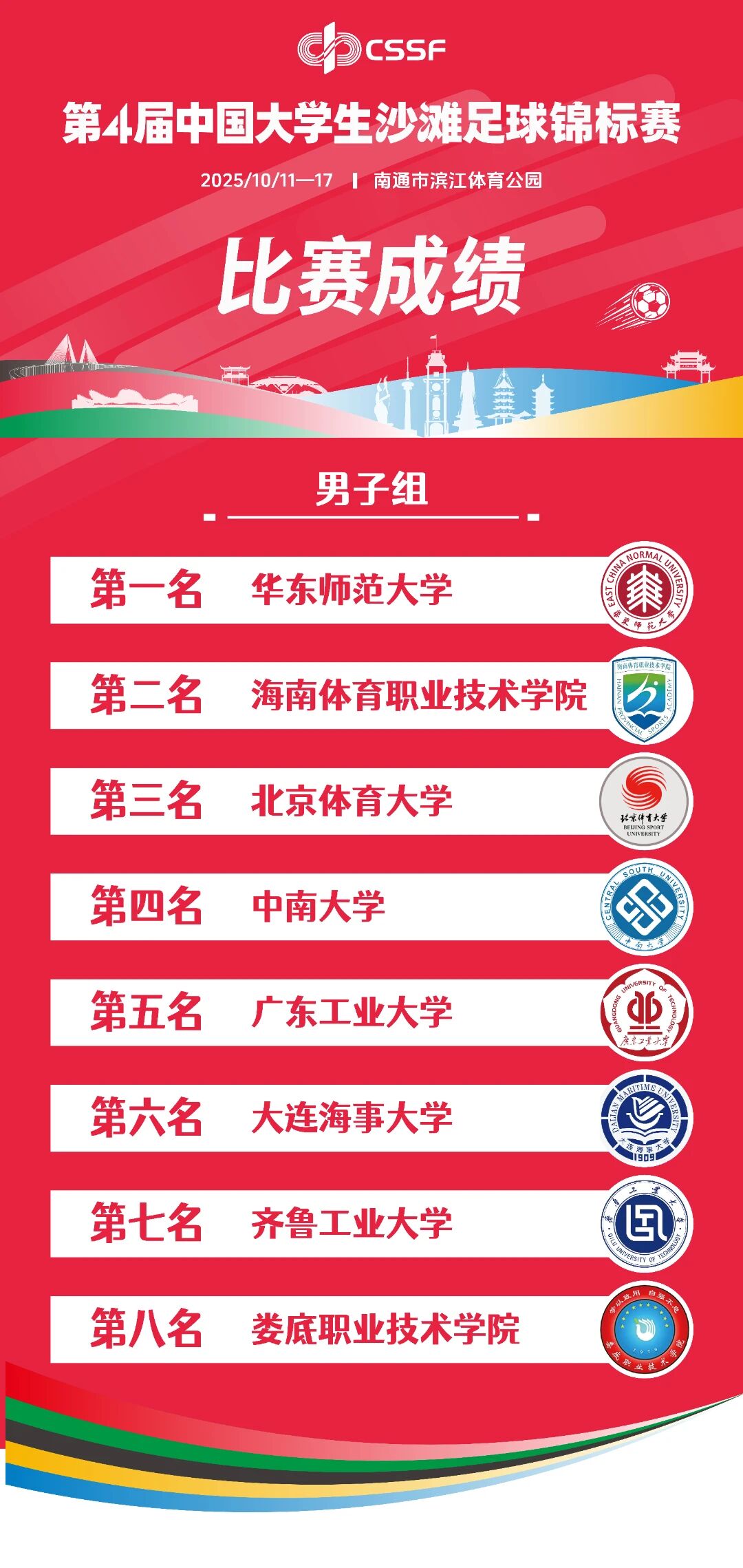 10月11日至17日,由中國學生體育聯(lián)合會主辦的第4屆中國大學生沙灘足球錦標賽在江蘇省南通市濱江體育公園舉行。華東師范大學男子足球隊在教練員劉宇的帶領下,奪得全國總冠軍,展現(xiàn)了卓越的團隊實力與頑強拼搏的體育精神。