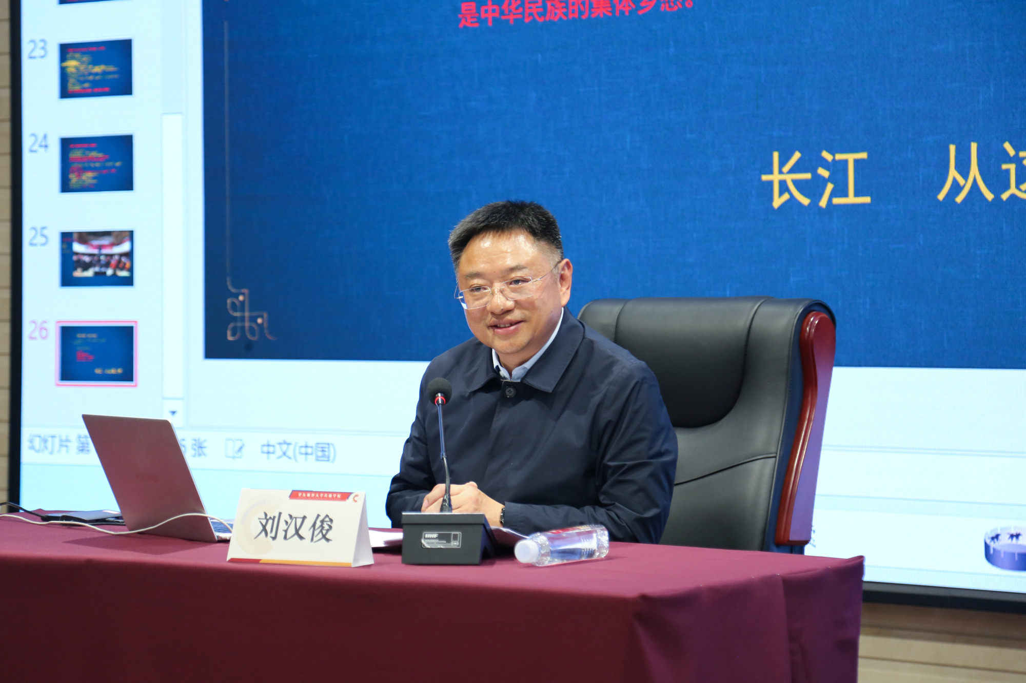 講座伊始,劉漢俊提綱挈領地概述習近平文化思想要點,他追尋習近平總書記考察長江的足跡,重點闡述黨的十八大以來,圍繞長江經濟帶發展這一區域重大戰略,習近平總書記主持召開了四次座談會的重要精神。劉漢俊結合剛剛閉幕的黨的二十屆四中全會精神,重點講解博大精深的長江文化,他從自然與文明的雙重維度解讀了長江的價值,將長江文化置于中華文明“二元結構”的宏大敘事中,以宏闊視野揭示了長江與黃河兩大文化系統如何通過“互補、互敬、共生”,孕育出中華文明獨一無二的韌性與活力。