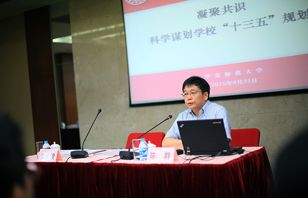 8月31日上午,校長陳群首先作大會開場報(bào)告,校黨委書記童世駿主持會議。陳群表示,今年是我校全面深化綜合改革方案正式獲批、全面鋪開之年,是新一輪學(xué)科建設(shè)的啟動之年,同時(shí)也是制定“十三五”規(guī)劃的關(guān)鍵之年,現(xiàn)在所確定的思路和共識,將直接決定未來五年學(xué)校的發(fā)展和走向,因此本次會議意義重大。他回顧總結(jié)了上學(xué)期學(xué)校的整體工作開展情況,學(xué)校各項(xiàng)工作主要圍繞“改革”和“發(fā)展”兩條主線全面展開,實(shí)施了第一次院系整體考核,接受了教育部巡視組巡視,一批重點(diǎn)實(shí)驗(yàn)室也經(jīng)歷了評估,在學(xué)校黨委的領(lǐng)導(dǎo)下,在全校師生的共同努力下,學(xué)校各項(xiàng)改革穩(wěn)步推進(jìn),各項(xiàng)重點(diǎn)工作順利實(shí)施,取得了不錯(cuò)的成績,保持了良好的發(fā)展勢頭;在深入分析學(xué)校發(fā)展面臨機(jī)遇和挑戰(zhàn)的基礎(chǔ)上,著重介紹了學(xué)?!笆濉币?guī)劃制定的基本思路和主要內(nèi)容,即圍繞建設(shè)世界知名高水平大學(xué)的中長期發(fā)展目標(biāo),通過實(shí)施學(xué)科交叉、國際化和信息化戰(zhàn)略,完成深化綜合改革、建立現(xiàn)代大學(xué)制度,完成學(xué)校戰(zhàn)略轉(zhuǎn)型、通過改革來保持和發(fā)展學(xué)校在教師教育方面的特色與優(yōu)勢,完成學(xué)校學(xué)科的整體布局、形成新的優(yōu)勢特色學(xué)科,重視和加強(qiáng)人才培養(yǎng)、培育創(chuàng)新人才和棟梁學(xué)子,堅(jiān)持以提高質(zhì)量為核心的內(nèi)涵發(fā)展,希望大家在分組討論中圍繞規(guī)劃里的內(nèi)容,暢所欲言,充分發(fā)表意見,通過集體的智慧共同把學(xué)?!笆濉币?guī)劃制定得更細(xì)更實(shí),為學(xué)校下一輪的改革和發(fā)展積蓄能量。此外,陳群還結(jié)合學(xué)校國家自然科學(xué)基金的申報(bào)情況,深入分析了學(xué)校的科研、師資等現(xiàn)狀及對策。