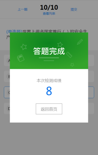 自我檢測(cè)可對(duì)自身學(xué)習(xí)掌握情況進(jìn)行自測(cè),可自主設(shè)置題目類型以及答題數(shù)目進(jìn)行檢測(cè)。答題結(jié)束,自動(dòng)生成測(cè)試成績(jī)(答對(duì)題數(shù))。再次進(jìn)入自我檢測(cè)模塊時(shí),會(huì)出現(xiàn)歷史檢測(cè)記錄,點(diǎn)擊進(jìn)入可查看答題信息。