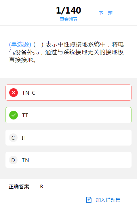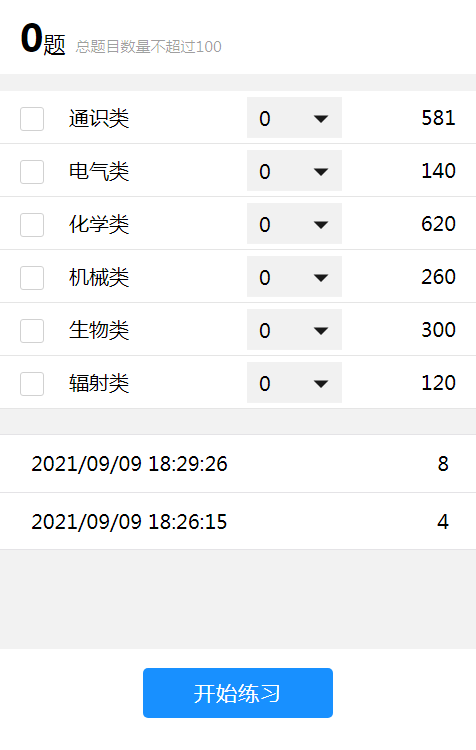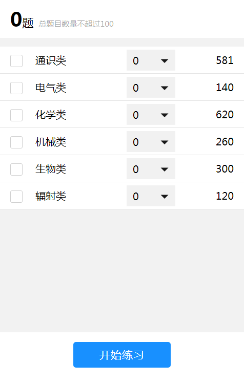 題庫(kù)含通識(shí)類(581道)、電氣類(140道)、化學(xué)類(620道)、機(jī)械類(260道)、生物類(300道)、輻射類(120道)六類題型共2021道題。學(xué)生自主選擇一類題型開(kāi)始練習(xí),練習(xí)過(guò)程中選擇答案后會(huì)出現(xiàn)正確答案,錯(cuò)題自動(dòng)進(jìn)入錯(cuò)題集,若對(duì)題目有疑問(wèn)或不確定可手動(dòng)點(diǎn)擊“加入錯(cuò)題集”;點(diǎn)擊“查看列表”,可顯示當(dāng)前題庫(kù)答題信息(正確/錯(cuò)誤/未作答)。