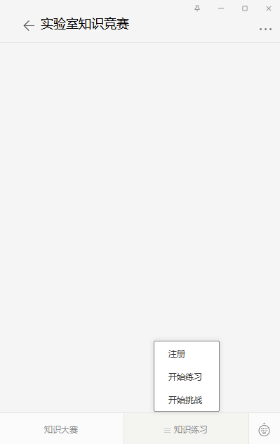 微信搜索公眾號(hào)“實(shí)驗(yàn)室知識(shí)競(jìng)賽”,關(guān)注公眾號(hào),點(diǎn)擊左下角“知識(shí)練習(xí)”,進(jìn)行“注冊(cè)”報(bào)名,具體操作詳見(jiàn)附件一。