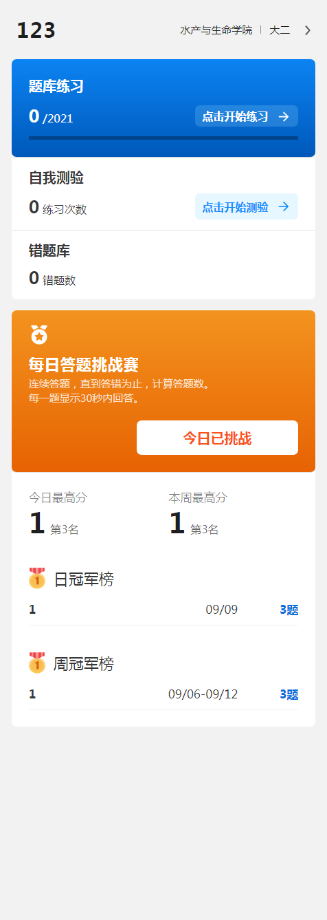 所有注冊(cè)學(xué)生每人每天可以進(jìn)行一次在線挑戰(zhàn)答題,系統(tǒng)在題庫(kù)中隨機(jī)抽題,每題答題時(shí)間為30’,每答對(duì)一題得1分,答對(duì)進(jìn)入下一題,答錯(cuò)或答題時(shí)間結(jié)束,挑戰(zhàn)終止,所獲分值為該學(xué)生的當(dāng)日參賽積分。
