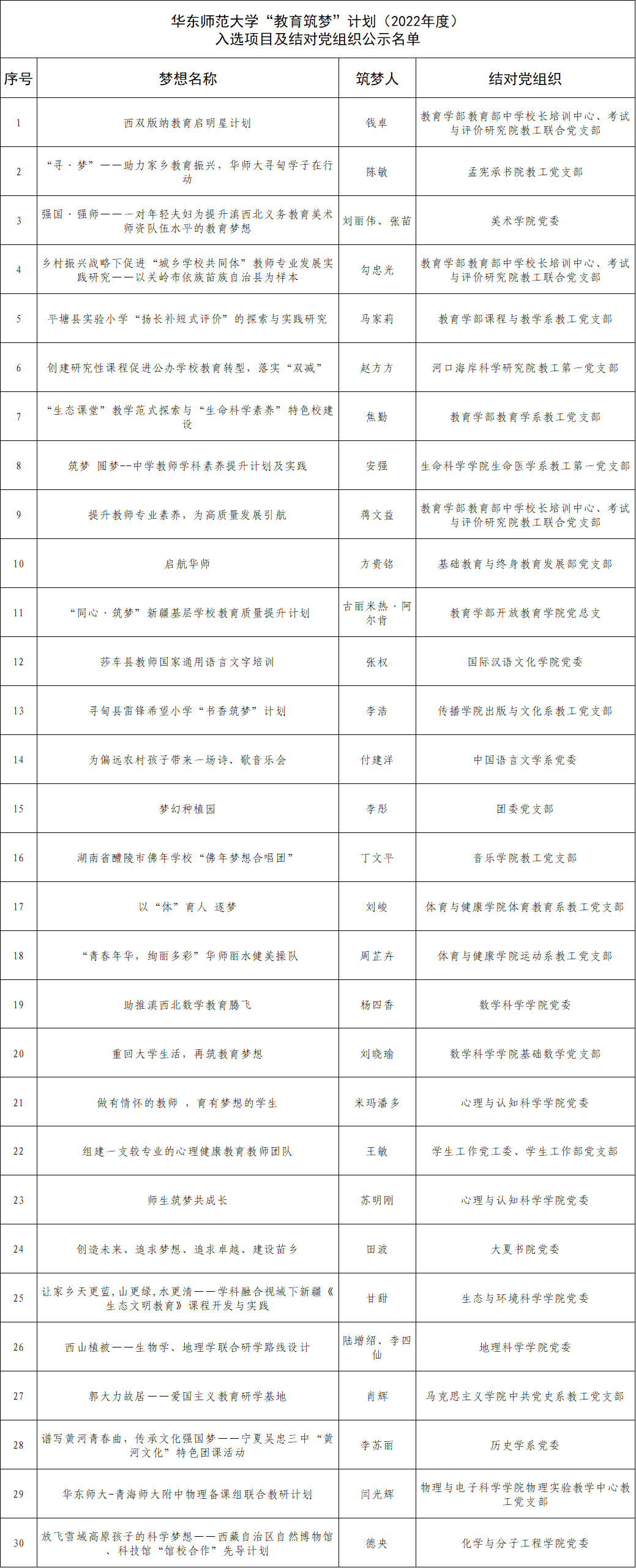 根據華東師范大學“教育筑夢”計劃(2022年度)實施方案,經校友自主申報、專家評審,現將華東師范大學第二期“教育筑夢”計劃(2022年度)入選名單及結對黨組織名單予以公示。