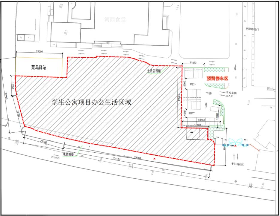 附圖:河西食堂西側停車場臨時設施場地平面圖(紅色虛線范圍內為臨時設施區域)